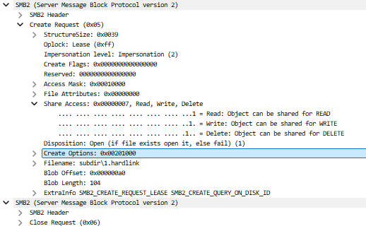 In SMB2 create operation, the share access was set to “Share Access: 0x00000007 SHARE_DELETE SHARE_WRITE SHARE_READ”