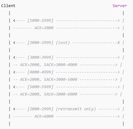 Receiver tells sender exactly which blocks of data were received successfully (e.g., “I have bytes 1000–2000 and 3000–4000, but I’m missing 2000–3000”).